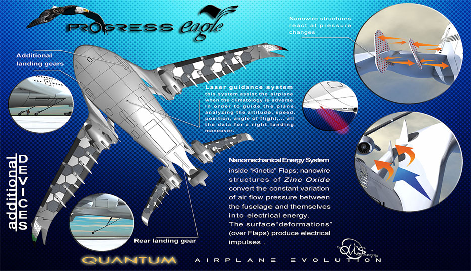 “Il miglior aspetto di Progress Eagle sarà la sua capacità di generare da sé la propria energia.” ha detto Vynals in merito al suo progetto, aggiungendo che l’aereo sarà anche più silenzioso di circa il 75% degli aerei attuali. Il rivoluzionario velivolo non sarà infatti alimentato con i tradizionali combustibili fossili, ma sarà dotato di sei motori a idrogeno per consentire il decollo, un grande motore posteriore con una turbina eolica e pannelli solari posizionati sulle ali e sul tetto.