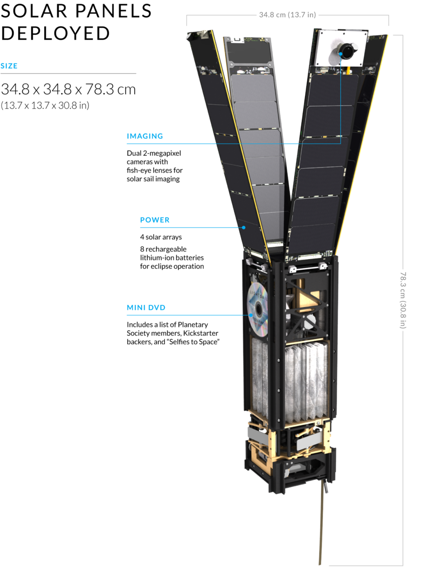 Le seguenti 3 immagini mostrano le altrettante fasi di apertura della vela solare. Sono inoltre presenti numerose caratteristiche tecniche.